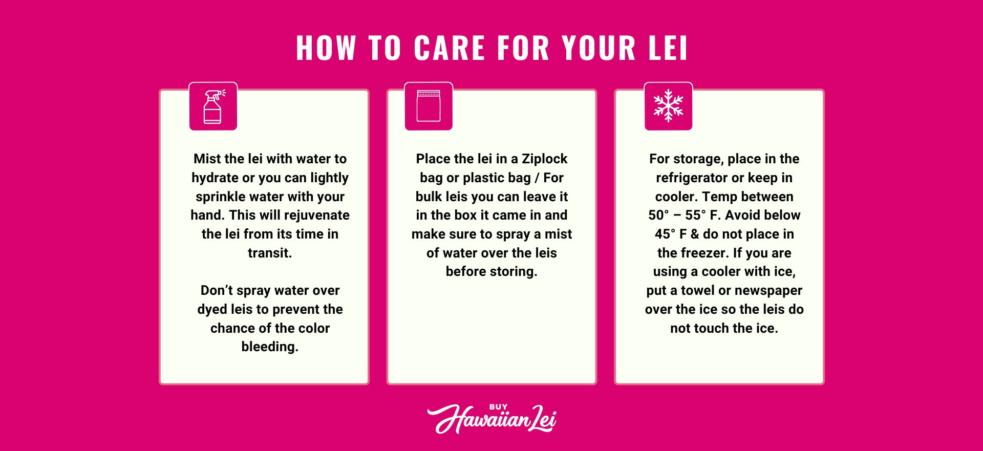 - The proper care can help your lei last longer. Almost all orchid lei styles, as well as ti leaf, Maile lei should last about 3-7 days after arrival. For Pikake, tuberose lei or any fragrant lei, they are more sensitive and have a shorter shelf life.